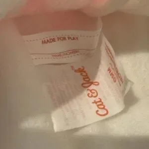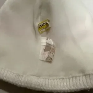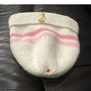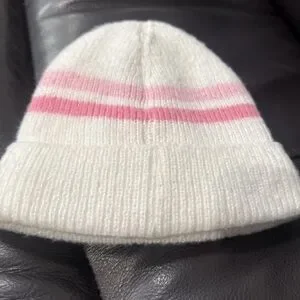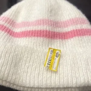 Cozy white knit beanie with pink stripe detail. Soft, warm fabric ideal for everyday wear. Simple style that pairs easily with kids' outfits. Pink and white design adds a playful touch.