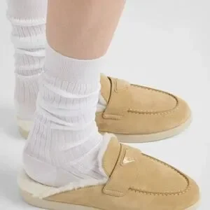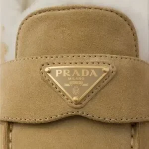 Elegant tan mules with plush fur lining. Features iconic Prada logo. Perfect for cozy elegance.