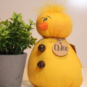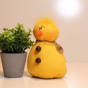 Cute yellow plush chick accent adds charm to any room. Soft fabric construction with whimsical face and jingle-button details. Bright yellow color brings cheerful warmth to your decor. Brand New from Honey and Me her name is Chloe and she would go great with any easter set up