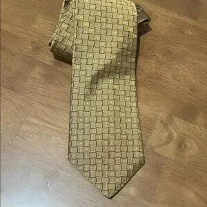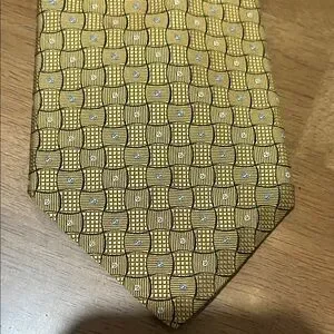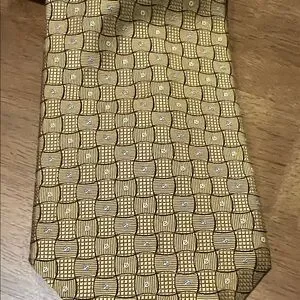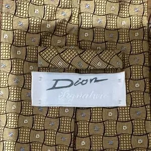 Elegant Dior tie with a gold and black geometric pattern. Perfect for sophisticated occasions.