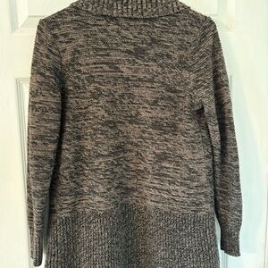 The neutral brown/charcoal marled knit pairs easily with jeans, leggings, or workwear for a casual cozy look.