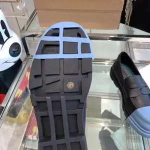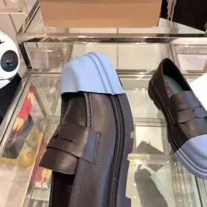 Stylish Camper slip-on loafers in black leather with contrasting baby blue rubber toe caps. Chunky sole and penny loafer strap detail. Cushioned insole for comfort. Modern, eye-catching design for everyday wear.