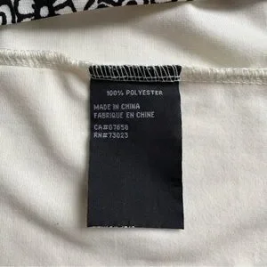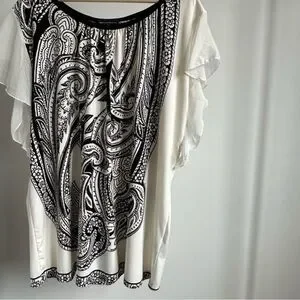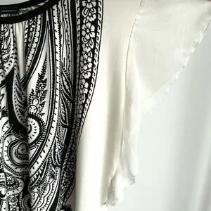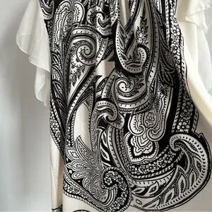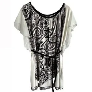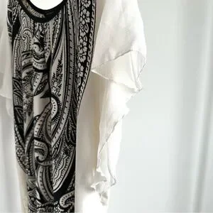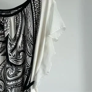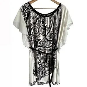 This QED London tunic top dress features a white and black ethnic paisley design. The dress has flirty sheer ruffle sleeves and is made of stretchy 100% polyester fabric. It comes with a thin black belt that can be worn or left off according to your preference. Paired with leggings to create a long top or worn as a short tunic dress. It can also be used as a beach cover-up due to its lightweight and comfortable nature. Women's large and in excellent condition.