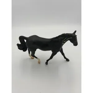 Breyer Reeves model horse from the 1997 Limited Edition collection features a striking matte black coat with a white blaze and one white sock. Intricate blue and yellow ribbon details are painted into the mane, adding a unique decorative touch to this collectible piece. This model is crafted with the classic Breyer attention to detail, capturing a graceful, walking pose.