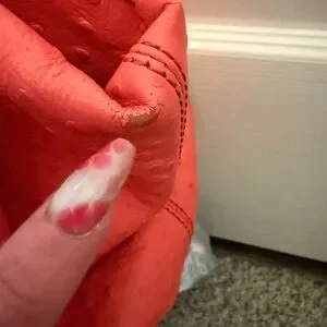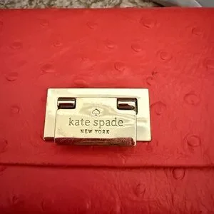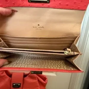 Chic coral shoulder bag and matching wallet by Kate Spade. Features a unique ostrich textured design. Ideal for stylish outings. Comes from a smoke free home.