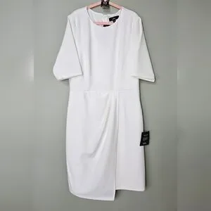 Sass and class come together perfectly with the Lulus Westwood White Half Sleeve Sheath Dress! Ponte knit shapes this perfect-for-work dress with half sleeves, crew neckline, and princess-seamed bodice. Fitted waist tops a flattering sheath skirt with front pleats and overlapping hem. Hidden back zipper/clasp.