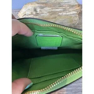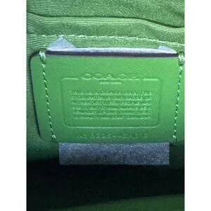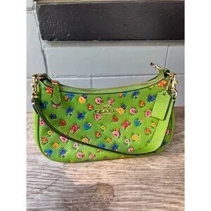 Preowned Coach Teri Shoulder Bag in neon green leather with Mini Vintage Rose print and gold-tone hardware. Features a zip-top closure, detachable shoulder strap, Coach hangtag, and a compact shoulder bag silhouette. Bright floral print and vivid green color make this a fun statement bag for spring and summer.