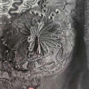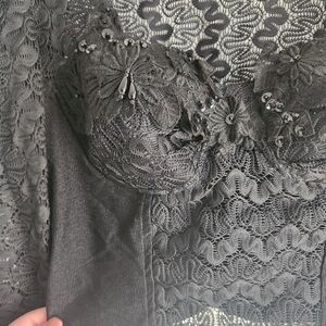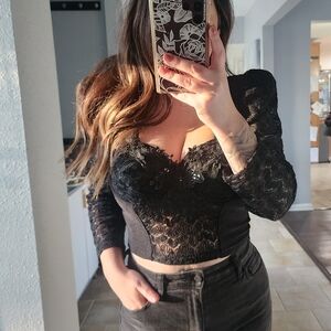 This black crop top showcases a delicate lace design, offering a fitted and cropped silhouette. The 3/4 lace sleeves and beaded detail, formed cups, and shoulder pads give it an elevated edgy look.