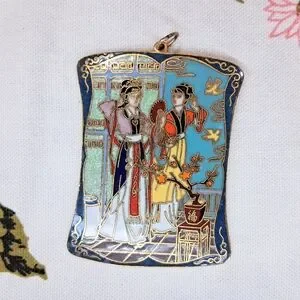 Vintage Cloisonne Pendant For Necklace Asian Scene Enamel