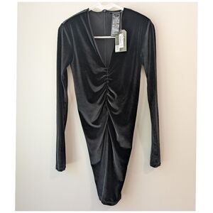 Fitted and flattering, we're looking to the Anya Dress for feeling good this party season. It's made from recycled fabrics with a velvety texture, but the shape is simple: long sleeves, plunging neckline, mini length. It's gathered at the waist for a more refined fit, while the shoulder pads add a little bit of structure.