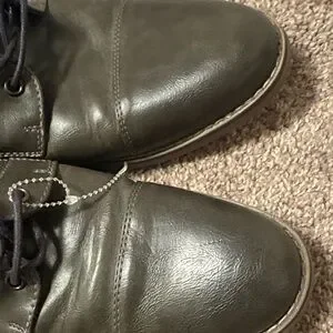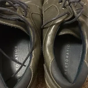 Men's leather lace-up oxfords by Restoration Hardware. Smooth olive green leather upper with tonal stitching. Cushioned insole for everyday comfort. Classic lace-up styling for versatile wear.