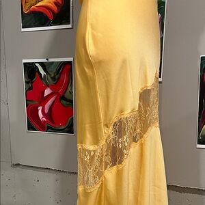 Elegant asymmetrical dress with delicate lace detail. Vibrant yellow color. Ideal for a bold look.