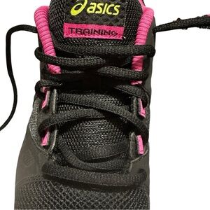 Lightweight ASICS running sneakers in black with pink accents.