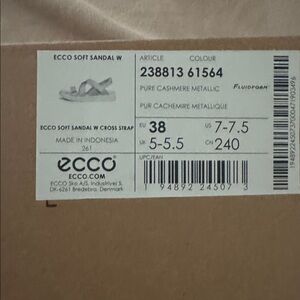 Ecco sandals featuring crisscross leather straps. Cushioned white sole for comfort. Slip-on style with secure straps. Neutral light metallic pairs well with many looks. Brand new in box.