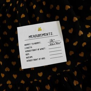 Rounded neckline ~ Three-Quarter length tiered sleeves with a flared end ~ Body is also a tiered design ~ Button closures all the way down the back ~ Swingy, slightly cropped silhouette ~ 100% silk unlined fabric ~ Black with a "Heart Flip" print in gold