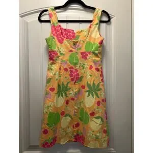 Celebrate summer in style with this vibrant Lilly Pulitzer sleeveless dress, featuring a fun, fruity print bursting with lemons, cherries, grapes, and greenery. Designed in a cheerful orange-yellow background, this dress embodies classic preppy charm with a modern twist.