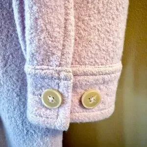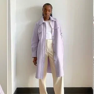 Wilfred Long Ganna Jacket from Aritzia in a beautiful soft lavender shade. This relaxed, shirt-style jacket is made from a cozy wool-blend fabric and features a button front, two chest pockets, and a curved hem. Perfect for layering through fall, winter, and spring.