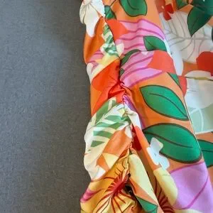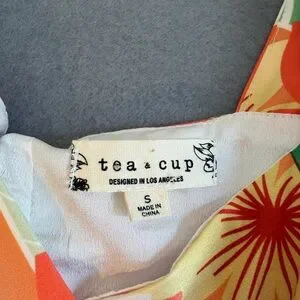 The tea & cup Floral Puff Sleeve Sweetheart Neck Ruched Blouse in size S is a vibrant and stylish top perfect for casual occasions during the summer and spring seasons. The blouse features a lovely floral pattern in hues of orange, yellow, white, green, and pink, with puff sleeves and ruffled accents adding a touch of charm. Made from lightweight polyester fabric, this blouse is designed for a regular fit and offers a zipper closure for easy wear. The sweetheart neckline enhances the feminine aspect of the top, making it a versatile and colorful addition to any woman's wardrobe.