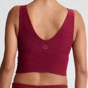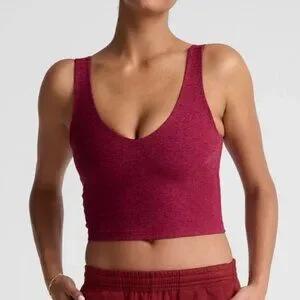Beyond Yoga Spacedye Good Day Cropped Tank in Size Medium. Bordeaux Heather color way is a deep maroon wine red. Front and back V neckline with self shelf bra for medium support. Cropped length. Buttery soft spacedye fabric is 87% Polyester, 13% Elastane. In excellent preloved condition with no known flaws, just downsizing my closet. Stock photos are accurate representation of the color. Photos of actual item taken in natural lighting.