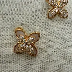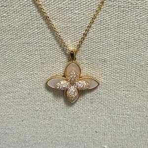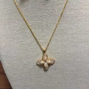 NWOT gold-tone necklace with clover flower pendant and matching post earrings. Pendant has mother of pearl background with rhinestone center on gold tone chain with lobster claw clasp & 2 inch extender.