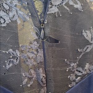 This stunning dress features elegant lace sleeves and a chic design, perfect for any occasion. The deep blue color adds a touch of sophistication. Slight tear in the lace in the back as seen in last photo. Make an offer