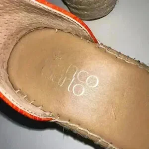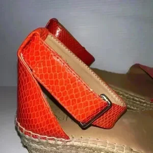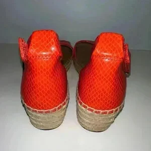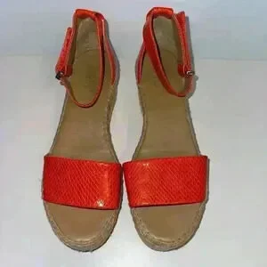 These are pre-owned women's sandals by the brand "Franco Sarto." They are a size 8 and feature a bright orange snakeskin-embossed leather upper with a jute wedge sole. The sandals have an ankle strap with a buckle closure. The sandals are in good condition with some minor wear and tear on the soles. The jute wedge sole is slightly worn down, and there are some minor scratches on the leather upper. Overall, these sandals are in good condition and ready to be worn.