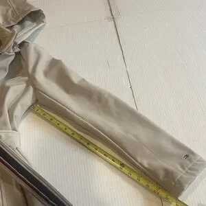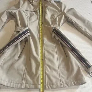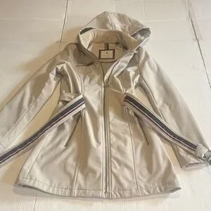 EUC Stylish women's beige jacket featuring a chic striped belt. Perfect for adding a touch of elegance to your wardrobe. Hood is removable. Belt has colors of red white and blue