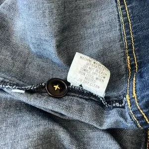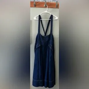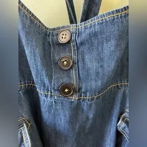 Our retro jumper skirt in cotton denim features a full-cut skirt and high banded empire waist with shoulder straps that button at the back.