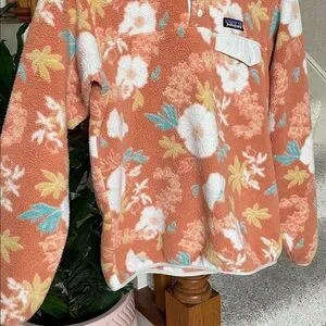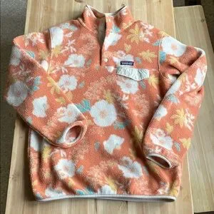 Soft fleece pullover featuring an orange base with floral patterns. Turquoise and yellow botanical accents add contrast. Snap closure at the neck and chest pocket with Patagonia logo. Cozy, casual layering piece. Great pre loved condition size medium