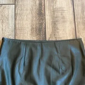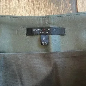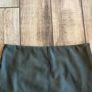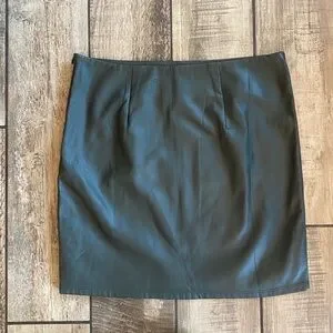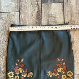 Dark gray faux leather skirt with red and yellow floral embroidery at the hem. Sleek, modern silhouette that pairs well with knitwear or blouses. Comfortable and stylish design for everyday or evening wear. Features vibrant embroidered details in red and yellow for a bold accent.