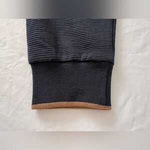 Soft ribbed crewneck sweater by Denim & Flower. Navy and tan color exterior with textured knit. Versatile everyday layering piece.
