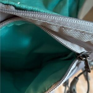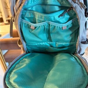 Stylish gray backpack with teal accents and multiple compartments. Features padded laptop section and zippered pockets. Very versatile 32L size, making it ideal for many occasions: hiking, commuting, traveling or daily use.