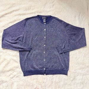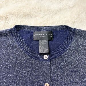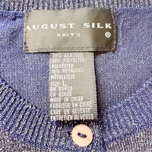 This August Silk metallic knit top, Size Large, blends timeless sophistication with today’s most in‑demand style trends—quiet luxury, metallic shimmer, elevated basics, evening‑casual chic, and soft glam minimalism. Crafted from a premium 70% silk blend, it has that smooth, lightweight drape and subtle silver sparkle that catches the light beautifully without feeling over the top.