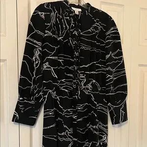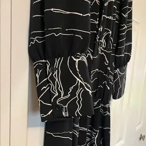 Flowing maxi silhouette with a black base and white abstract horse line print. Long sleeves and a modest neckline. Soft drape for easy wear. Sleek, modern pattern for day or evening.