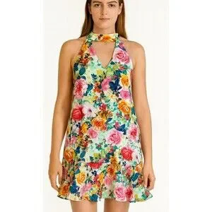 floral halter dress, sleeveless summer dress, vibrant flower print, keyhole neckline, ruffle hem dress, tropical dress, colorful mini dress, beachwear, resort fashion, bold print dress