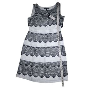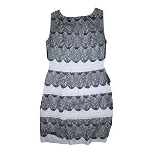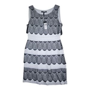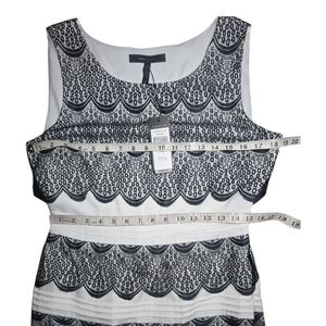 This sophisticated mini dress by BCBGMaxAzria showcases a striking black and white tiered design, perfect for cocktail events. The sleeveless sheath silhouette features a crew neck and a chic combination of delicate black lace and solid white bands, creating a timeless and elegant look.