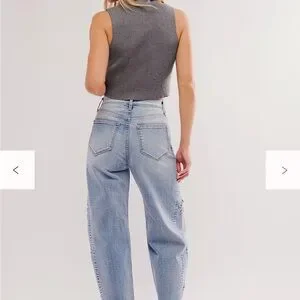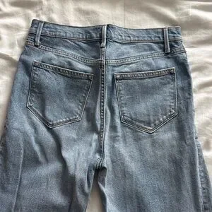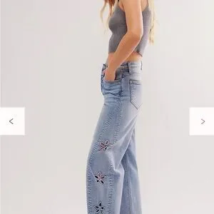 Light blue women's jeans with subtle floral cutout embroidery. SO CUTE on!!! No longer fit me!! 28 in inseam. I would say they run a little bit big for a 26.