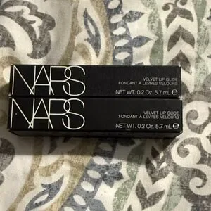 Two NARS Velvet Lip Glide boxes. Classic black retail packaging with white logo text. Compact lip gloss packaging for travel or gifting. La main bleue and danceteria