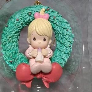 Precious Moments Home For Holidays Ornament Baby Girl Wreath Enesco 1996, used in good condition (It is in its box, but it is damaged). Look at the pics for more details. Any questions let me know please.