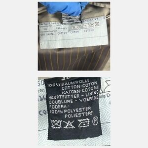 Fair vintage condition with visible wear consistent with age and use. Wear is present to the belt, including a missing button needed to secure the belt keeper; the keeper is included but cannot be fastened as intended. There is a stain on the cuff, a stain on the back, and a few additional small spots throughout. The back vent has a cracked/broken button and cannot be fastened.