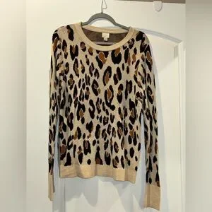 Stylish leopard print sweater with a blend of tan, black, and brown colors. Perfect for adding a wild touch to your wardrobe.