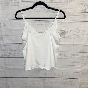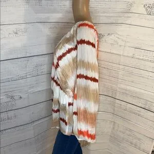 NWOT Stylish women's V-neck flowy blouse in cream with rust and tan stripes. Includes a white tank top with adjustable straps. Lightweight, breathable fabric with a flattering gathered waist. Versatile top that pairs easily with jeans or skirts. Includes comfortable long sleeves and a modern tie-dye inspired pattern. Size Large. Blouse 100% Polyester; White tank 95% Polyester/5% Elastane.