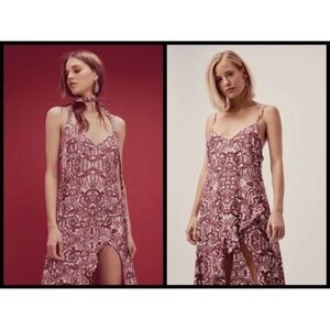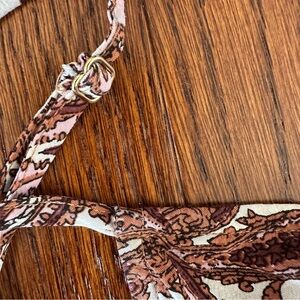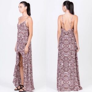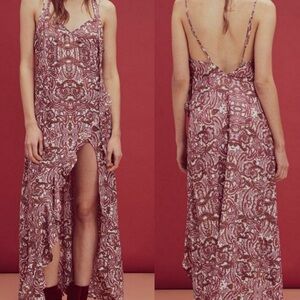 Floral and paisley print sleeveless maxi dress with a high slit and ruffle trim marked size S. This dress is pullover with adjustable straps. There is no zipper, so dress must be slipped overhead. Definitely more of an XS because of this.