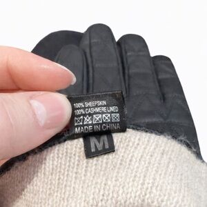Black 100% sheepskin leather gloves with 100% cashmere lining. Soft, supple leather with a quilted design and cozy interior for warmth and comfort. A timeless winter staple.