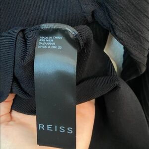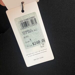 New with tags Reiss Savannah V-neck knit top in classic black featuring elegant sheer pleated long sleeves and a sleek fitted silhouette. The body is a soft stretch ribbed knit while the sleeves add texture and movement with delicate semi-sheer pleating. Sophisticated and versatile piece perfect for workwear, evenings, or elevated everyday styling.