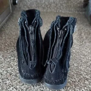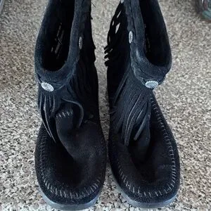 Minnetonka Black Suede Fringe Moccasin Boots with Concho Details