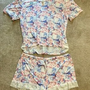 Jessica Simpson Pink Blue Lace Trim Pajama Set Shorts Sleepwear. So Soft! Large