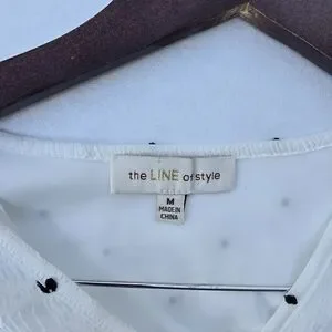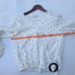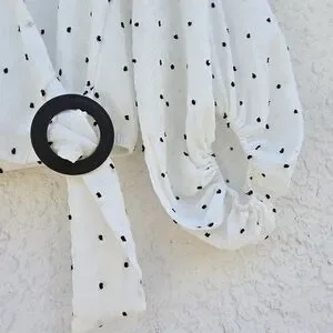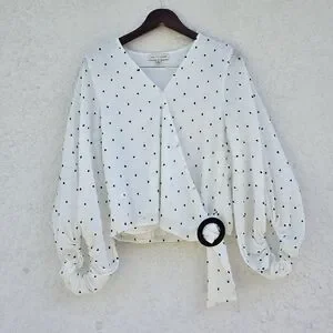Beautiful white wrap-style blouse featuring a classic black polka dot print.