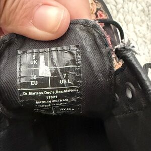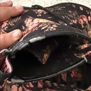 Classic lace-up combat boot silhouette. Black canvas upper with pink and cream floral print. Sturdy sole and secure eyelet lacing. Feminine floral pattern on a rugged boot for versatile style. Some wear sown in pictures.