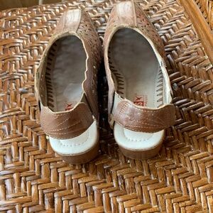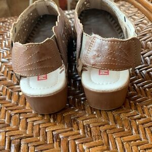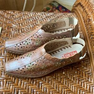 Elegant brown mules with intricate floral patterns. Perfect for casual wear.